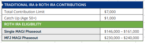 Table 1: Traditional Roth IRA Contributions & Income Limits